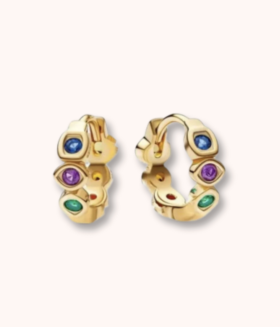 Playful and colorful, these small gold hoops are dotted with multicolored faux gemstones. A fun pop of color to elevate any outfit.