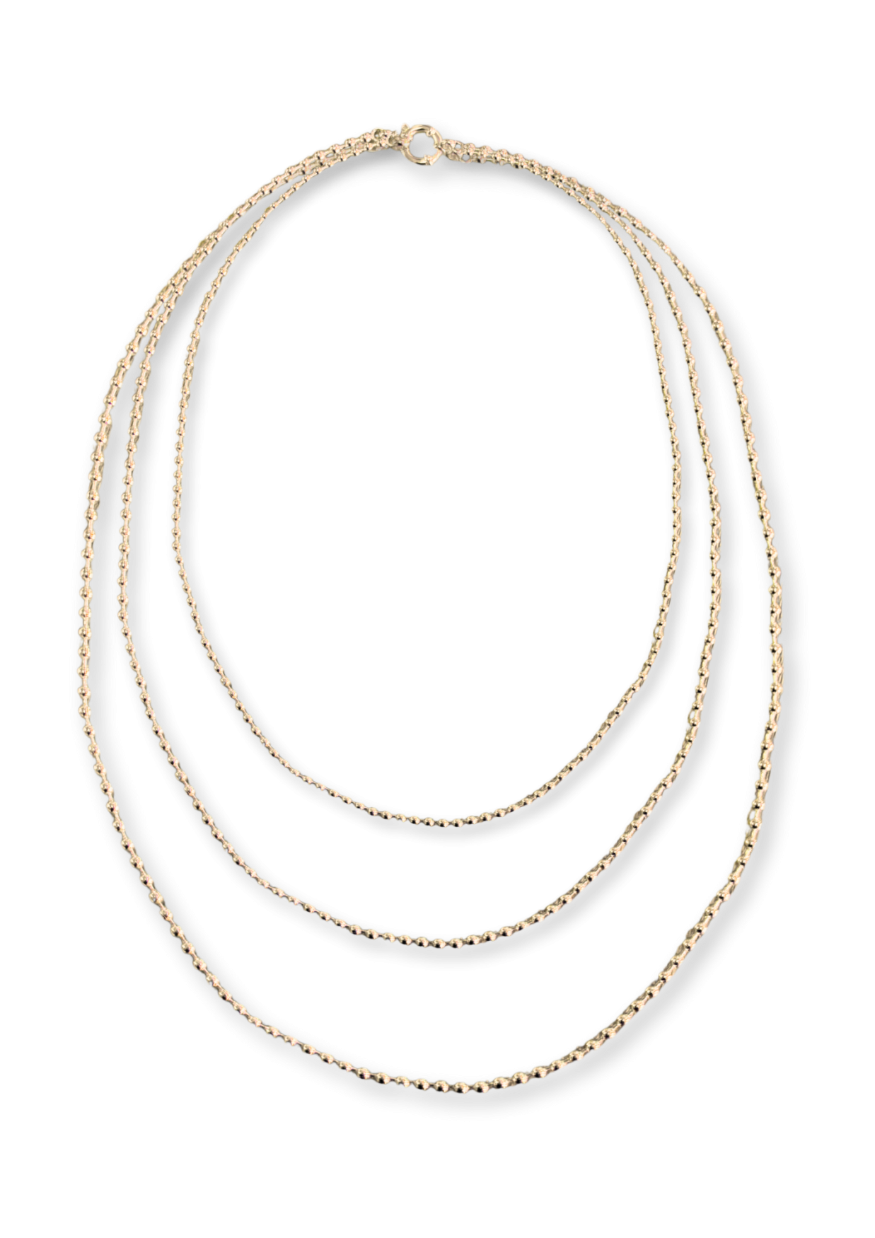 Delicate triple-layer necklace with three fine chains at varying lengths, creating a subtle, modern layered look perfect for any day.