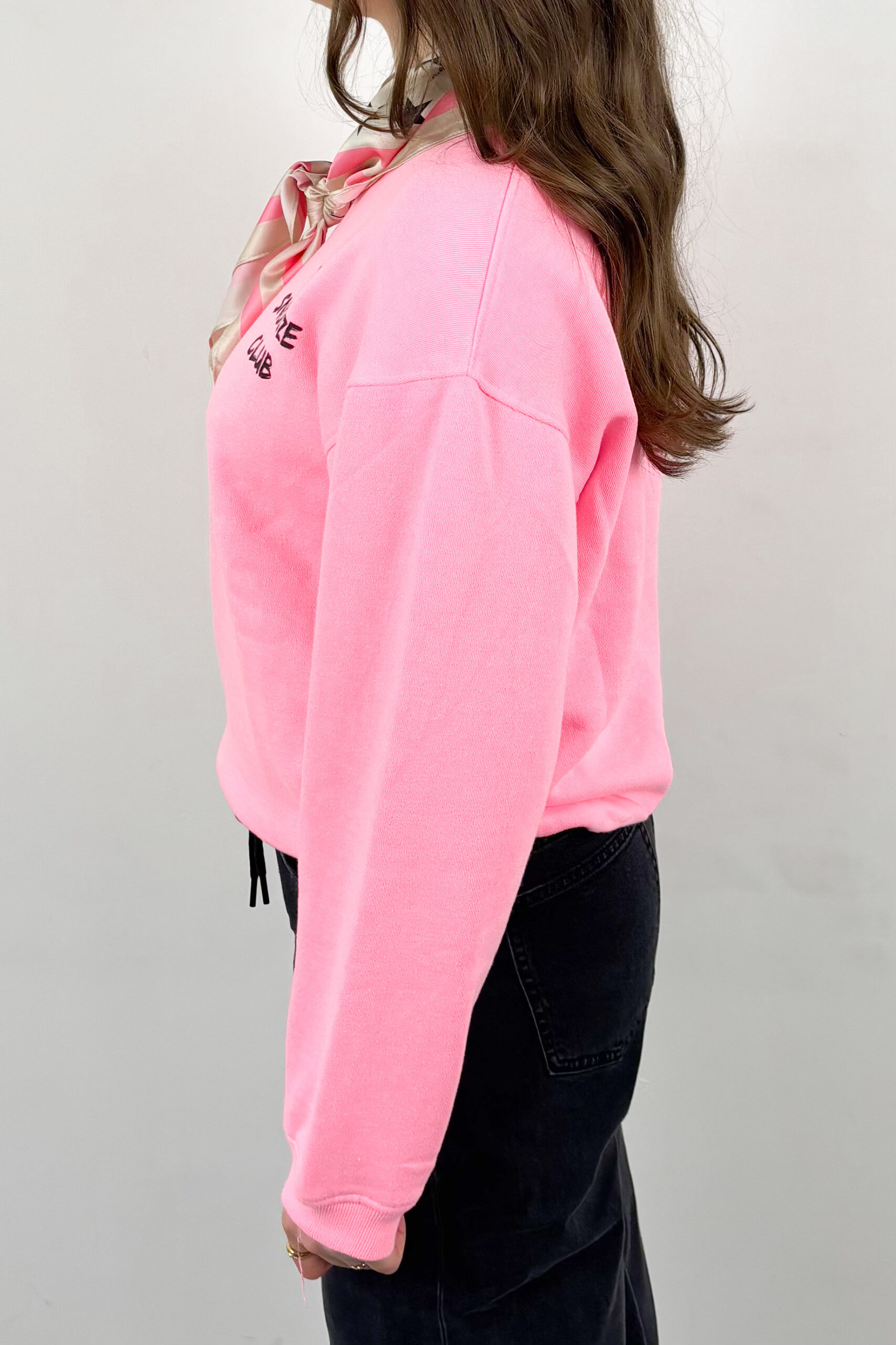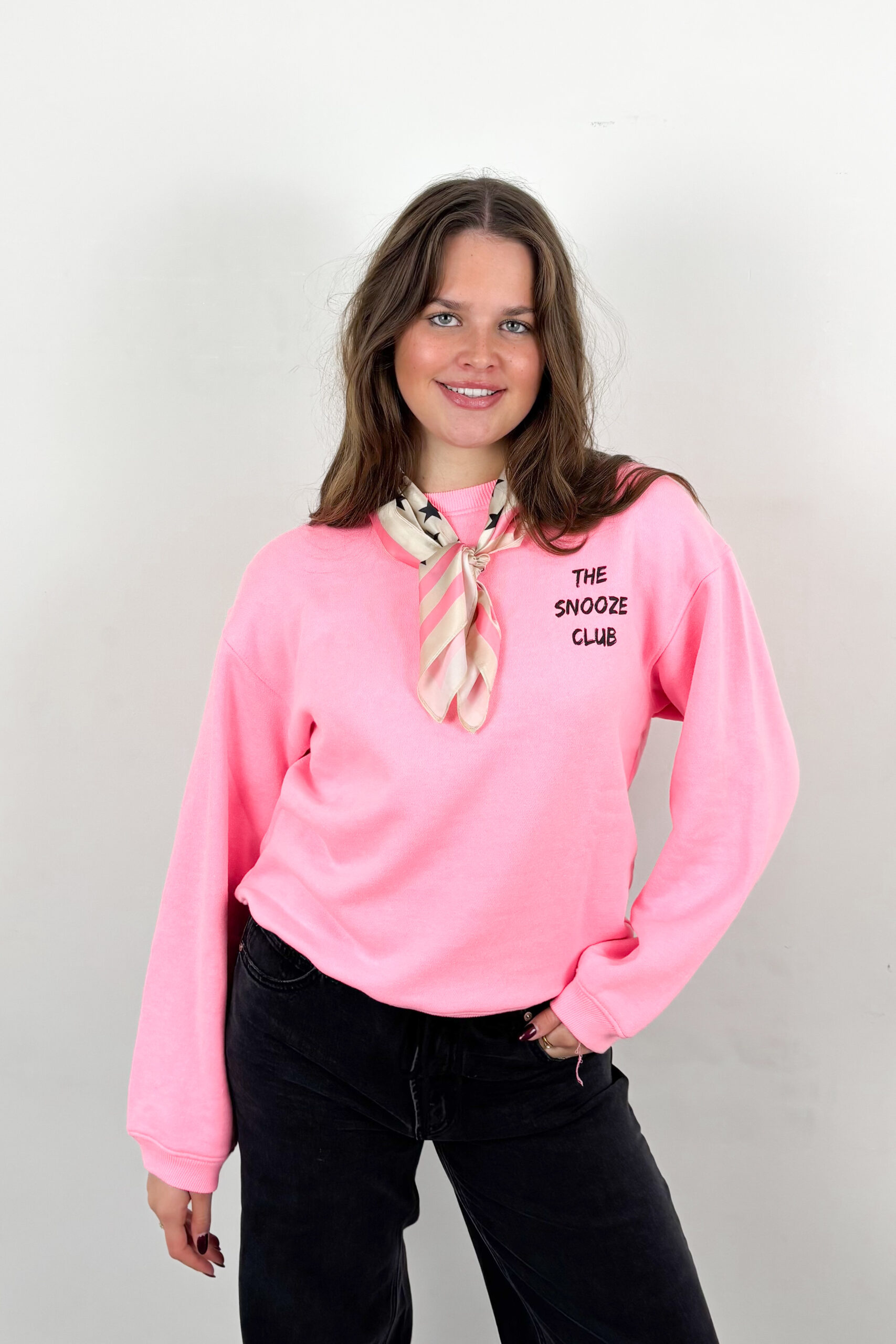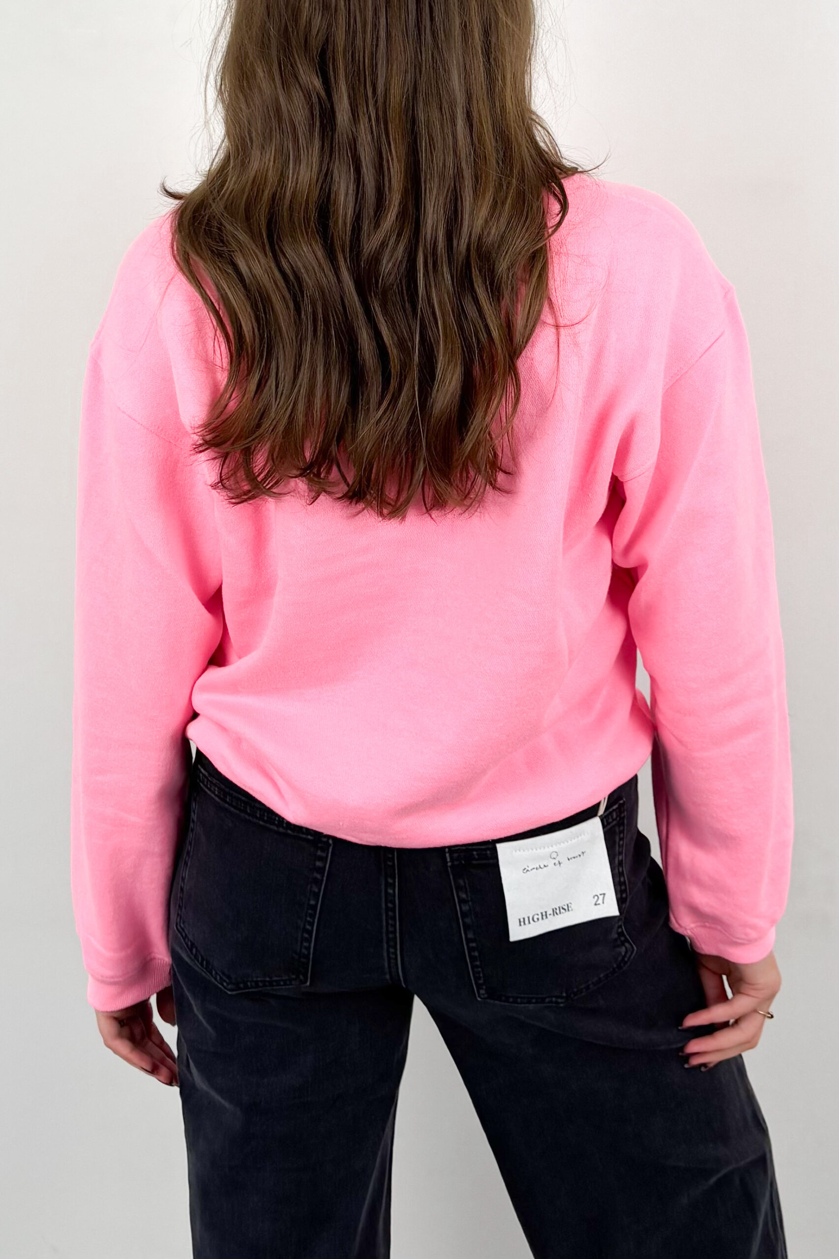 Boxy dames sweater, uitgevoerd in licht roze. De Lexi sweat heeft een loose fit en een zwarte print op de borst.