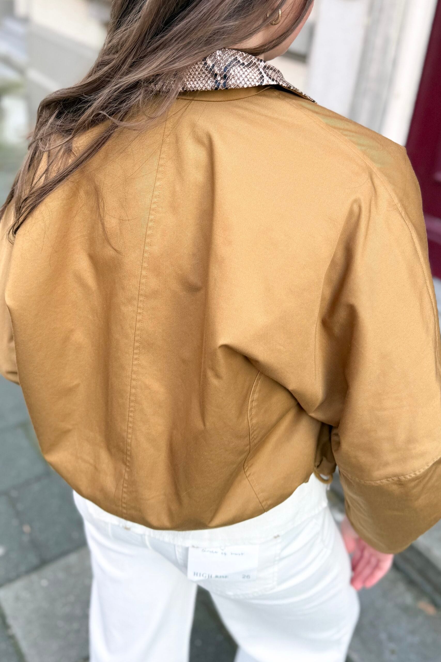 Deze camokleurige jas voor dames is een echte standout piece. De afgeronde vormen en de kraag in lakleer met slangenprint is een echte eye-catcher. Draag met denim voor een casual look of combineer met een geklede broek of rok voor een classy touch.