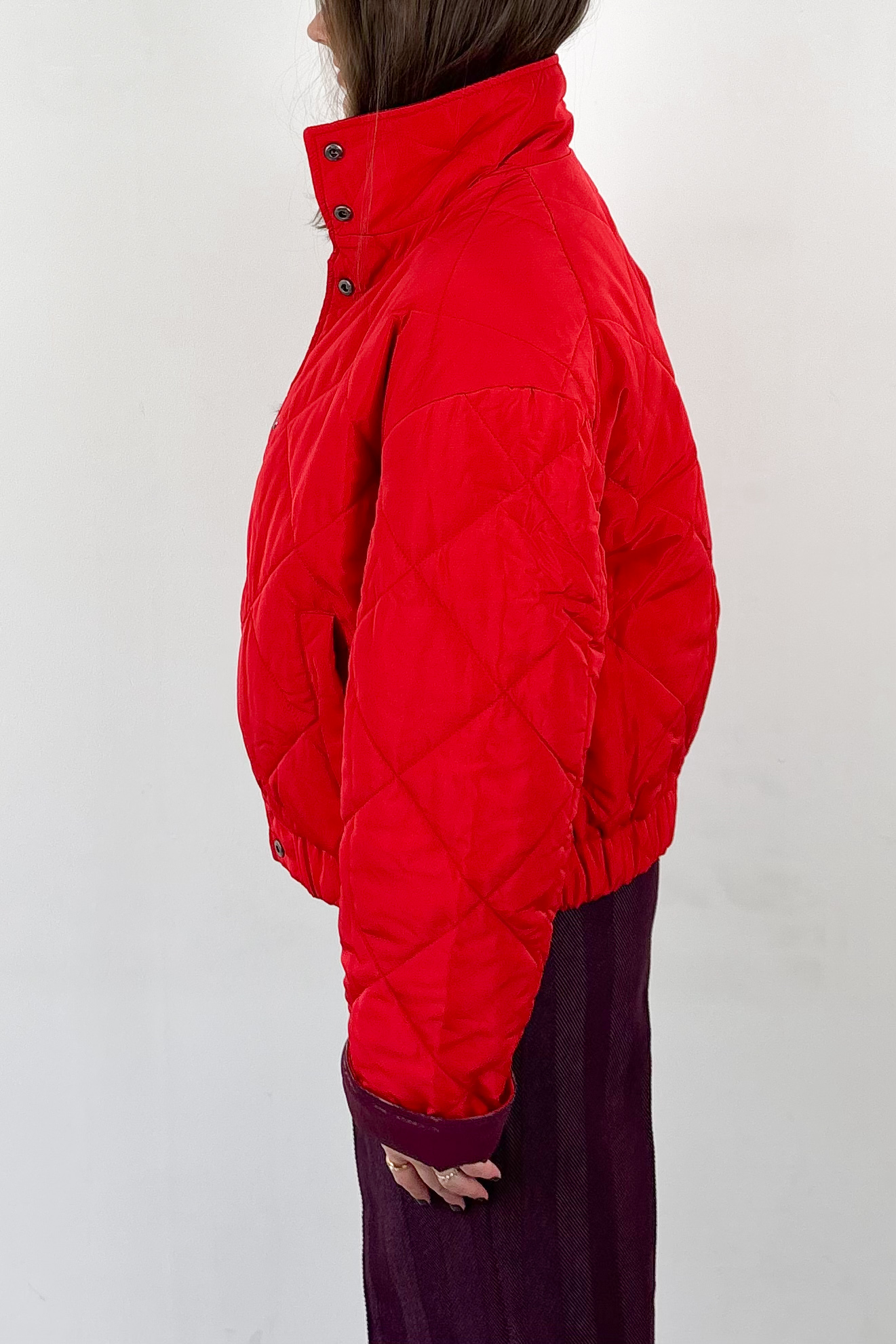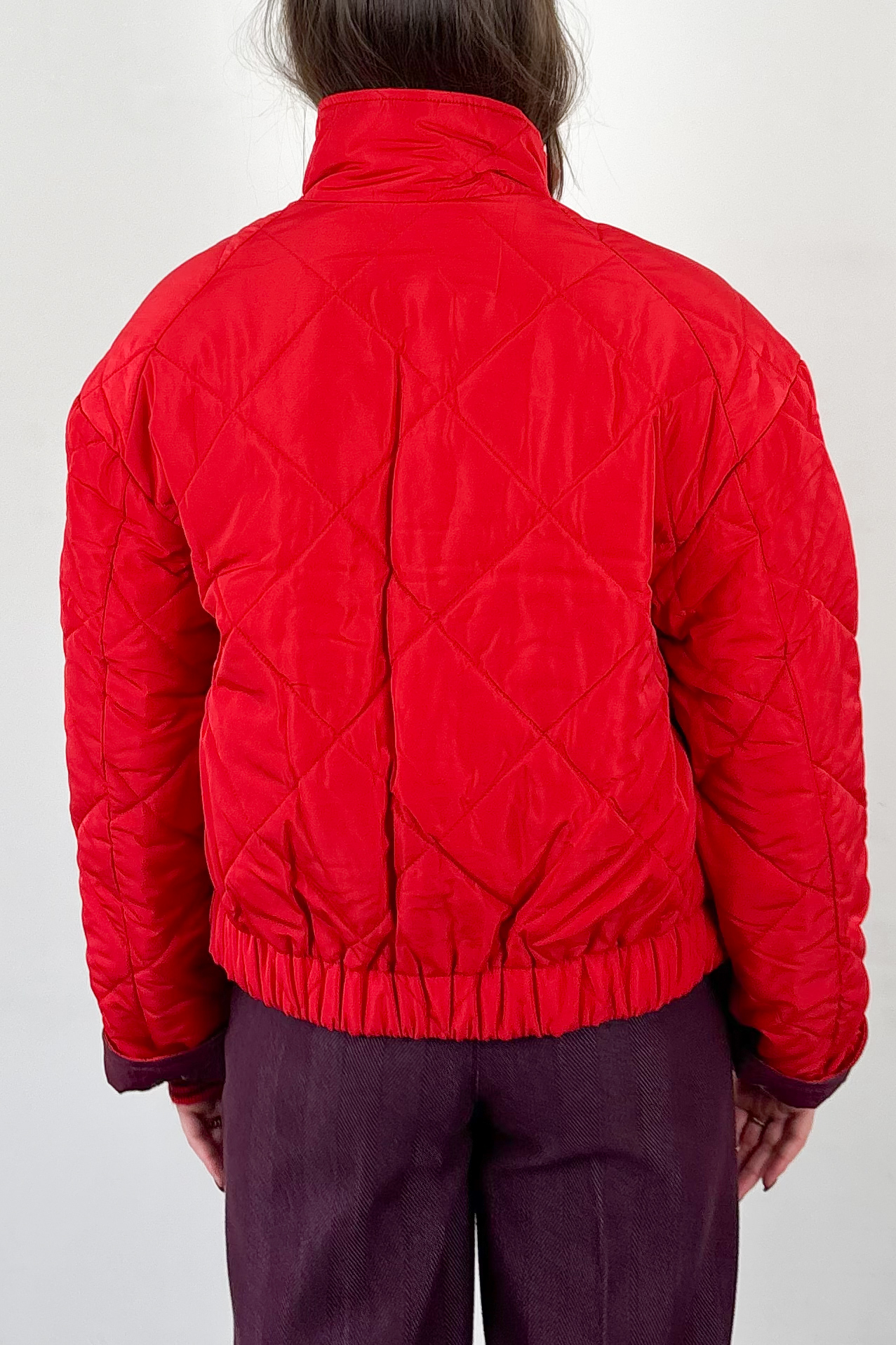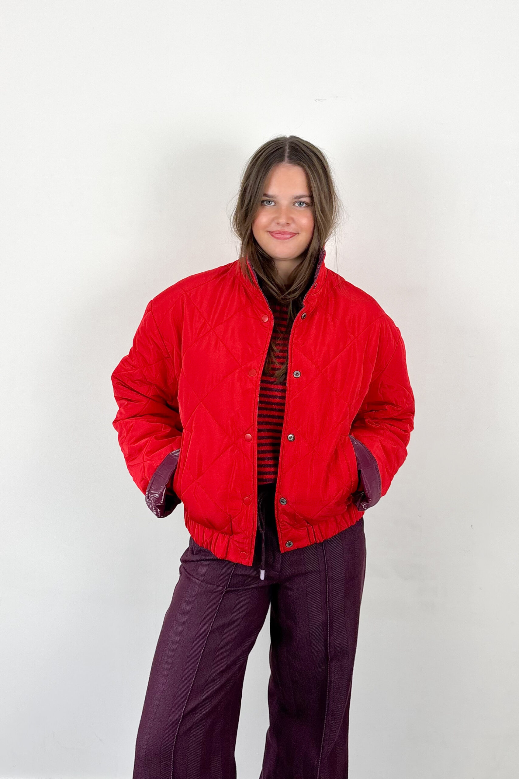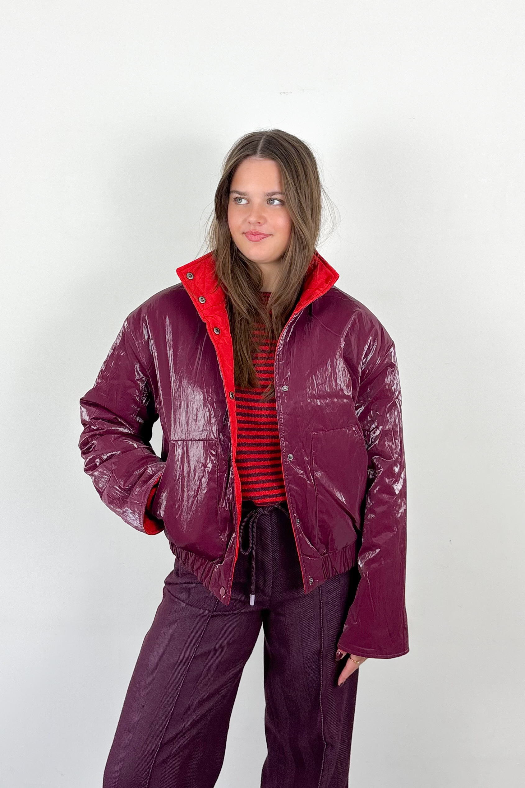 Meet the bomber jacket of your dreams! Hij is omkeerbaar, on-trend, heeft drukknopen en een opstaande kraag en is simpelweg onmogelijk te weerstaan. Kies voor de glanzende bordeaux kant of voor vuurrood afhankelijk van je outfit en mood. Deze herfst- en winterjas is voorzien van zakken en een elastische tailleband aan de onderzijde.